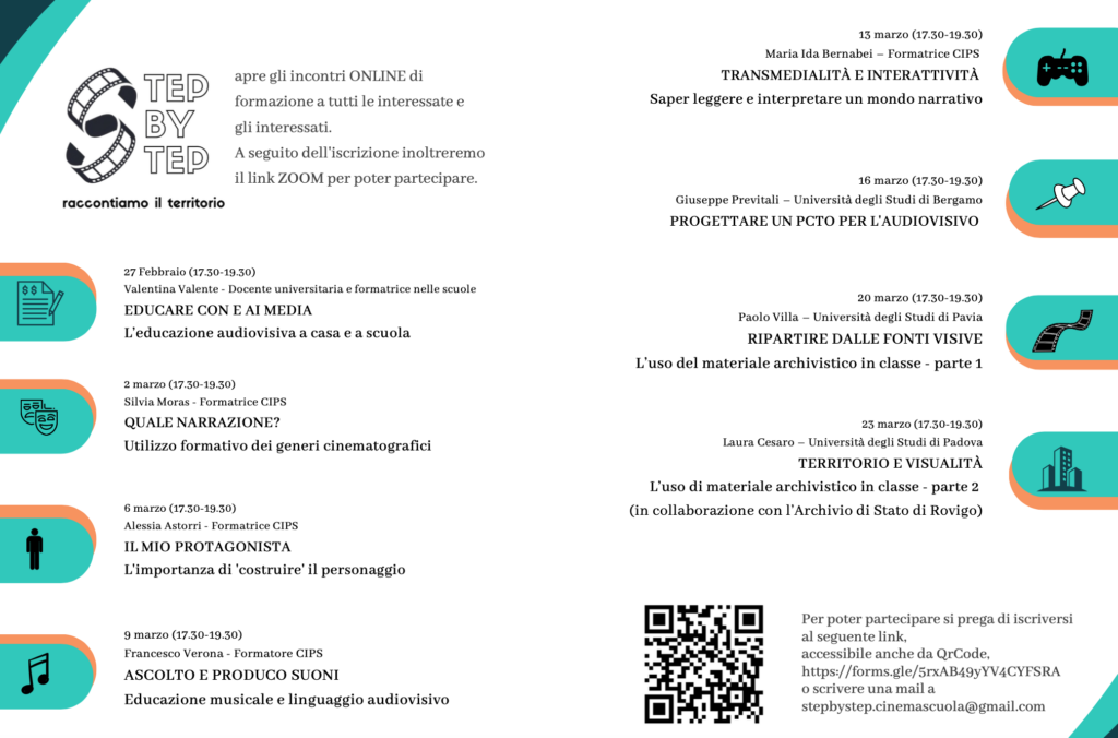 Febbraio 16, 2023 LET’S GO! Il gruppo di lavoro di Step by Step. Raccontiamo il territorio si allarga. 8 formatori per 8 appunti all’insegna della media education!Per poter partecipare si prega di iscriversi al seguente link, accessibile anche da QrCode o scrivendo a stepbystep.cinemascuola@gmail.com Fb Tw Ln
